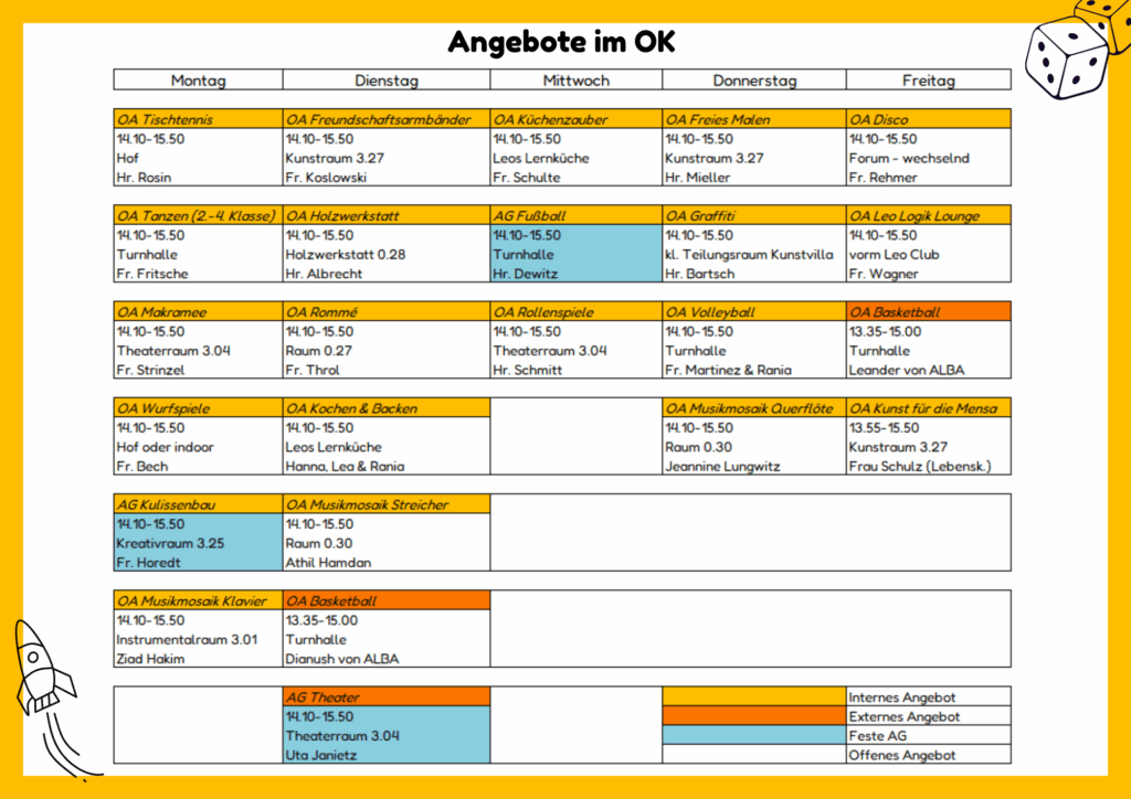 hier bekommen Sie eine Übersicht über den aktuellen Stand der AGs für dieses Schuljahr. Unsere AGs laufen bereits seit Anfang Oktober, nachdem wir den Schulstarter:innen Zeit ließen, sich im OK zurechtzufinden.