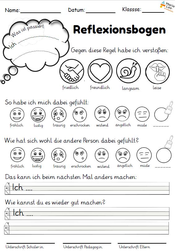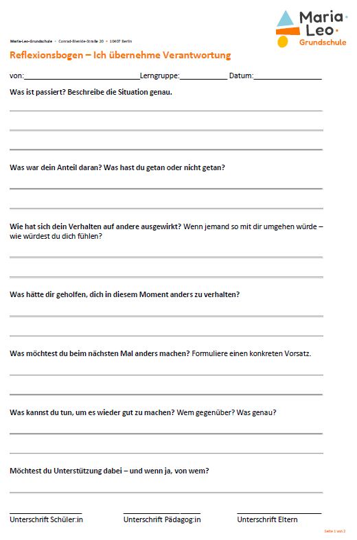 Im Rahmen unserer Demokratieerziehung und Konfliktlösung setzen wir auf die Reflexion von Verhalten und das aktive Einbeziehen der Schüler:innen in den Lösungsprozess. Ein wichtiger Bestandteil dieses Vorgehens ist das Schreiben von Reflexionsbögen.
